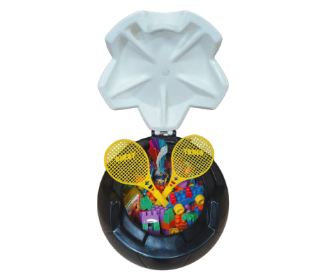 Baú infantil para armazenar brinquedos, com tampa, a tampa pode ser utilizada como banco quando fechado, formato bola, produzido em polietileno.