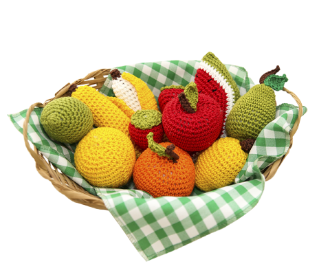 Cesto com 12 frutas de crochê confeccionado em linha de algodão com 100% preenchida com lã acrílica.