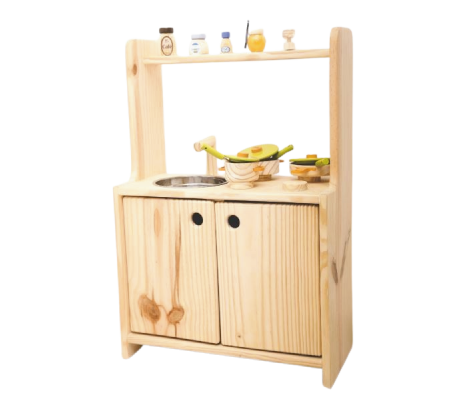 Confeccionada em tábua de Pinus Blank maciça, dobradiças contém amortecedor. Acompanha 1 pia. Acabamento selador atóxico e lustração dupla.