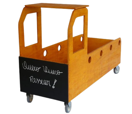 Confeccionada em tábua de Pinus Blank maciça e compensado, rodas de borrachas com eixo.