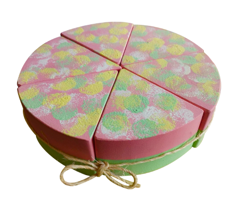 Acompanha a base de madeira na medida aproximada de: 25cm com 6 fatias pintadas com tinta atóxica.